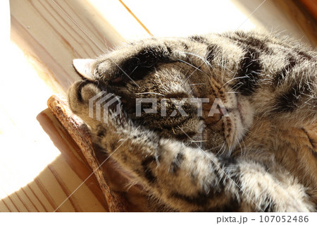 写真素材:経年劣化した琉球畳の上でくつろぐネコの姿 キジトラ猫モカシリーズ