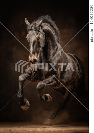 Black horse rears in a dark studio. Dust swirls under dramatic lighting.
