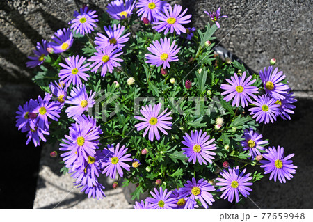 屋外で咲く紫の小さな可愛いブラキスコメの花のクローズアップ