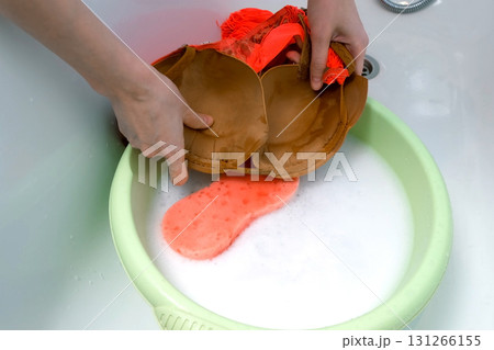 Woman is washing dance dress in basin in soapy water, laundry by hands.