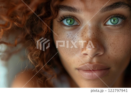 Amazing caribbean woman with curly hair and green eyes close up portrait. Neural network ai generated