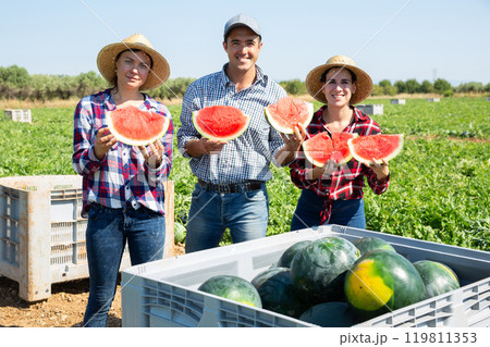 Smiling plantation workers holding slices of watermelons