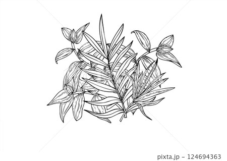 Vector tropical areca palm and tradescantia leaves bouquet line art black ink. Monochrome foliage hand drawn isolated illustration in linear style. Floral composition greeting card, invitation.