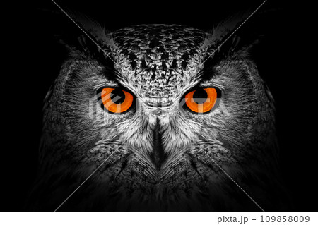 Owl looking big red eyes out of the darkness close