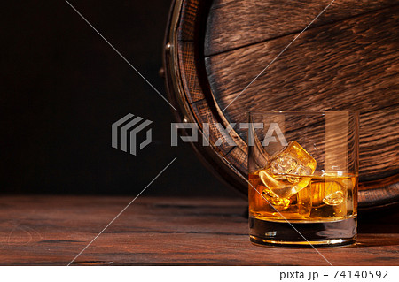 A glass of whiskey with ice cubes on old oak barrel