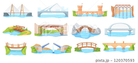 Cartoon river bridges. Concrete steel urban bridge, railway transport connection highway road with suspension construction pillars architectural tower set neat vector illustration