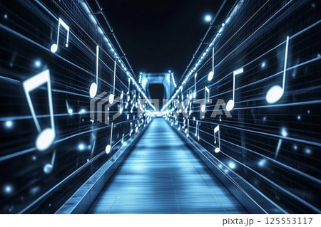 Musical bridge illuminated with shining notes creating a harmonious atmosphere at night