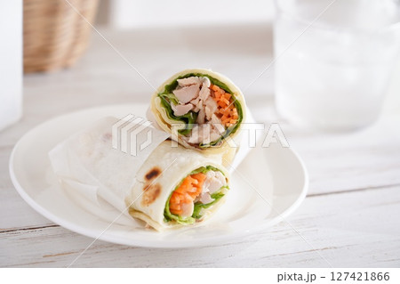 Tortilla wrap with fried chicken meat and vegetables isolated on white background
