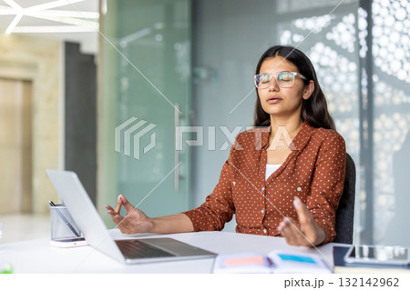 Office worker engaging in mindfulness meditation at her desk, enhancing mental wellness and promoting stress reduction while fostering a calm and focused work environment