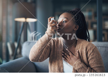 Asthma attack, medicine and a woman with inhaler to breathe in a house for health and wellness. Anxiety of a sick black person with medication for healthcare, lungs or chest and respiratory problem