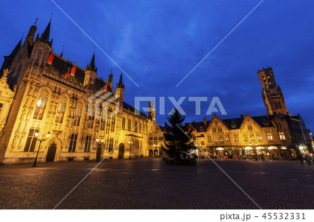 Evening view of Historic Bruges City Hall building on Burg Square in Bruges, West Flanders, Belgium