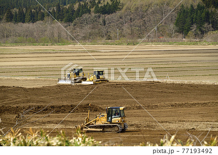 春の北海道厚沢部町で畑の客土作業をする風景を撮影