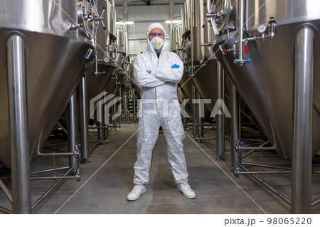 Male brewery technician wearing lab coat crossing arms on brewery floor near fermentation tanks