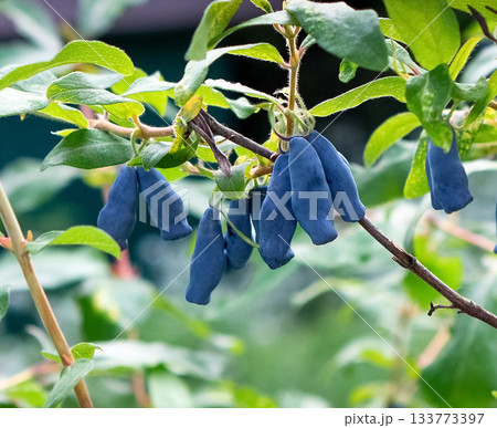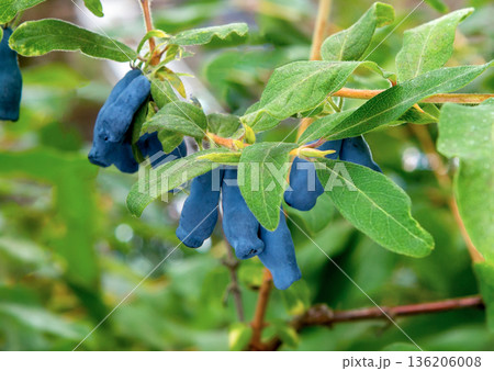 Honeysuckle berries on a bush. Blue berry.