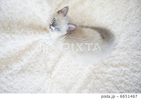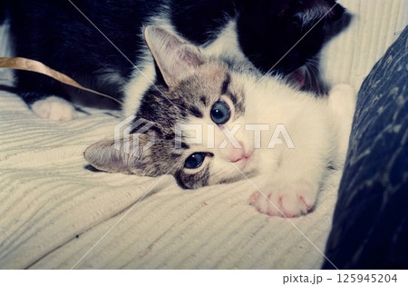 部屋でくつろぐ青い目の可愛い子猫。カメラ目線の子猫