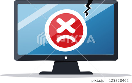 Illustration of a desktop computer screen with a sad emoji face, cracks across the screen, and a digital error message. Clean white background for easy integration in tech-related designs.