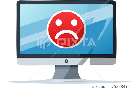 Sad red emoji on a cracked monitor represents a system malfunction or computer crash. Clean white background and simple design highlight the error message clearly.