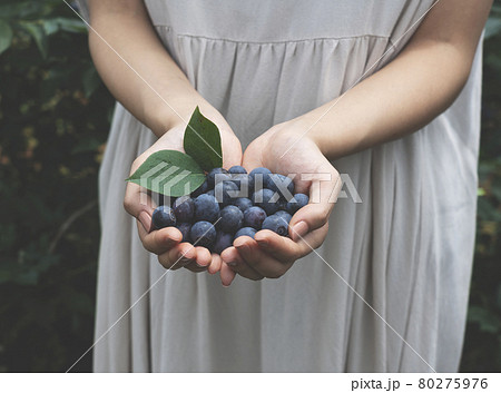 ブルーベリーを持つ女性の手