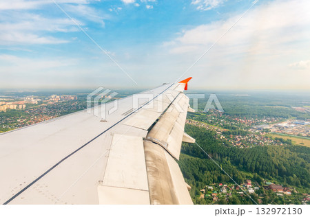 View of airplane wing, blue skies and green land during landing. Airplane window view.