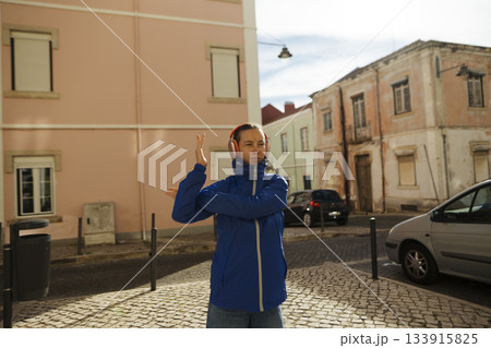 Individual in blue jacket standing among old buildings and vehicles
