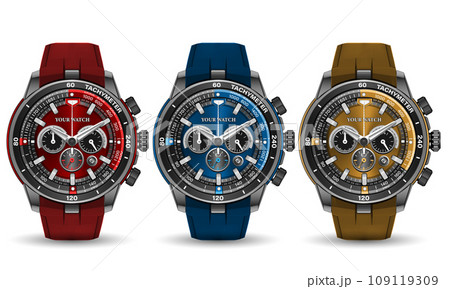 Realistic watch clock dark grey face white number with yellow red blue rubber strap on isolated design classic luxury collection vector