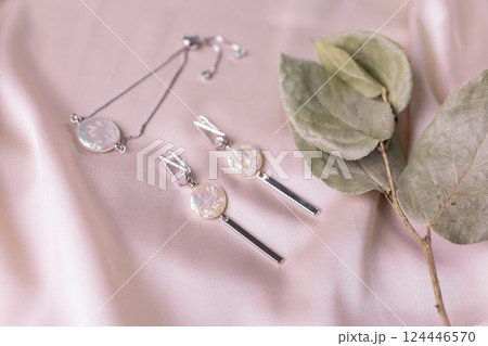 Women's Jewelry. Trendy jewelry on silk background. Flat lay, top view.