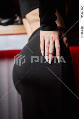 Elegant Young Woman Posing in a Black Dress Against a Grey Backdrop