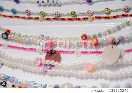 Bracelets with beads, shells and charms arranged on rolls for sale in a market. Jewelry, accessory and cultural creativity represented through consumer choice, style and artisan design.