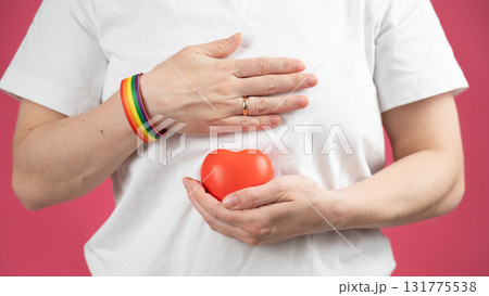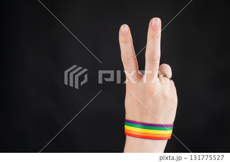 Woman with wedding ring and rainbow bracelet holding palm on black background.