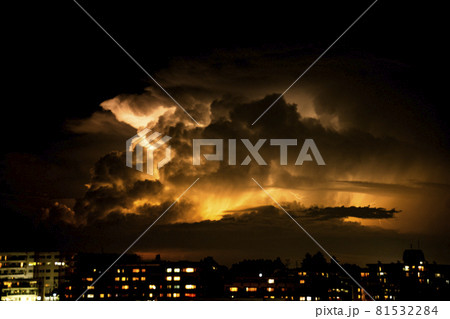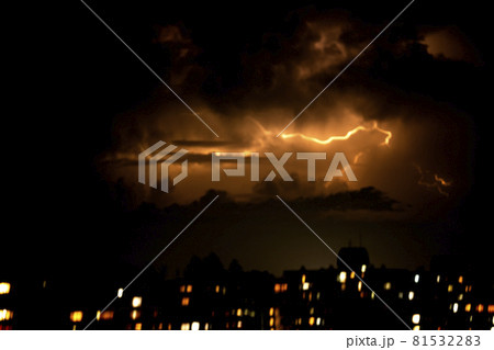 夏の夜、東京上空に稲光、手持ち撮影 ブレボケ