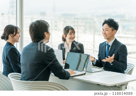 企業のオフィスで会議・ミーティング・商談をするビジネスマン・ビジネスウーマン
