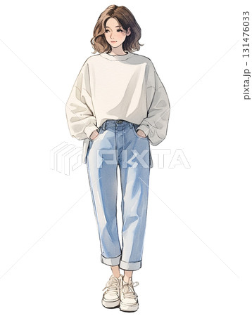 【女性立ち絵】オーバーサイズの白スウェットとデニムのナチュラルスタイル