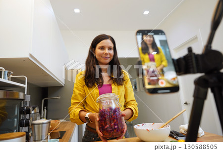 Young woman is broadcasting live from workshop how to prepare a vegetarian food