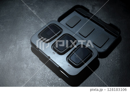 Clip on wireless microphone for interview or podcast equipment in the box on a black background