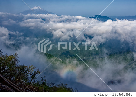 鬼ヶ岳から見る稜線を越す雲に映るブロッケン現象と南アルプス遠望