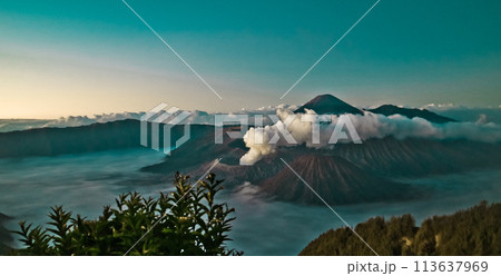 夜明けの噴煙を上げるブロモ山(ジャワ島東部)