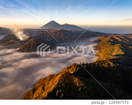 Aerial view Mountains at Bromo volcano during sunrise sky,Beautiful Mountains Penanjakan in Bromo Tengger Semeru National Park,East Java,Indonesia.Nature landscape background