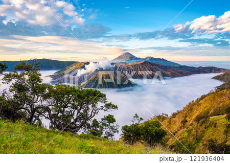 Beautiful Panoramic sunset view of Bromo active volcano in Bromo Tengger Semeru National Park, East Java, Indonesia
