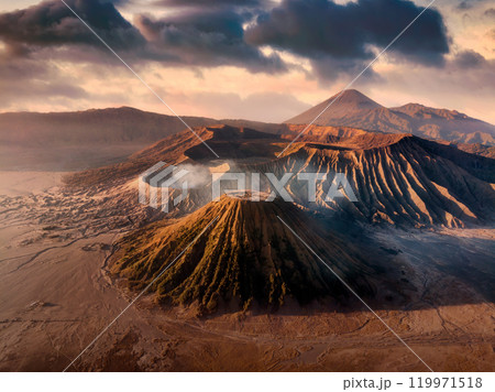 Aerial drone view of Bromo active volcano at sunrise,Tengger Semeru national park, East Java, Indonesia