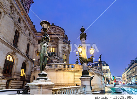 Palais Garnier is located in the 9th district of Paris, France. Winter scene features a bronze statue holding a lamp on the exterior facade covered in snow during the evening