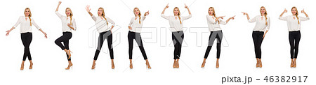 Pretty woman in tight black pants isolated on white