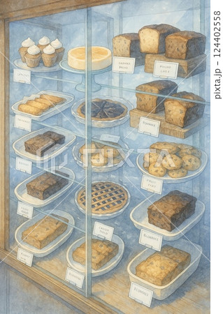 焼き菓子がぎっしり並ぶショーケース、ベーカリーとカフェの朝を描いたイラスト
