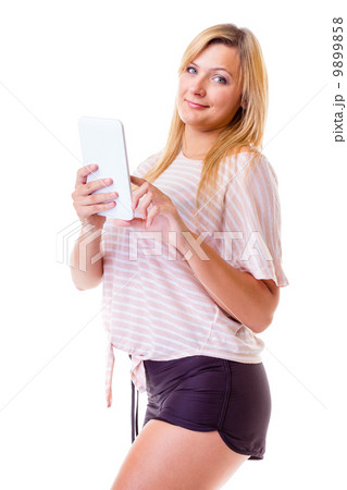 Woman girl using tablet touchpad reading e-book e-reader isolated