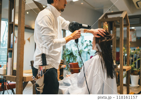 ドライヤーで髪の毛を乾かす男性スタイリスト・美容師と客の女性