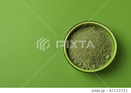 Bowl of matcha powder on green background