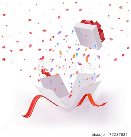 win prizes. vertical banner. white gift box on violet background and exclamation marks. Fireworks or confetti around. Cartoon origami style vector illustration.