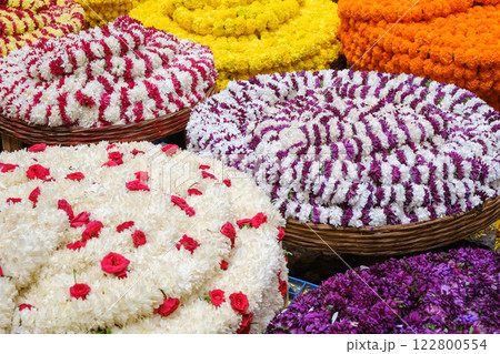 インドベンガルール_KRマーケットでガーランド(花輪)を売る商人