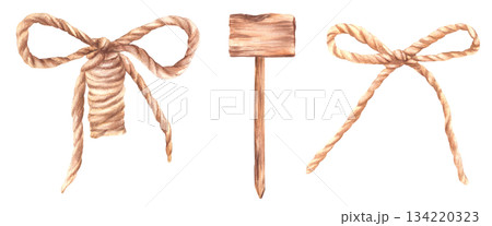 Jute string, rope bows with wooden signboards, price tag. Watercolor hand drawn illustration natural, eco accessories set for wrapping gifts, bouquets style realistic clipart isolated from background