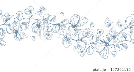 Eucalyptus branches with flowers and butterflies. Graphic illustration hand-drawn with ink line art. Seamless border pattern floral garland design for spring, summer holidays, and weddings.