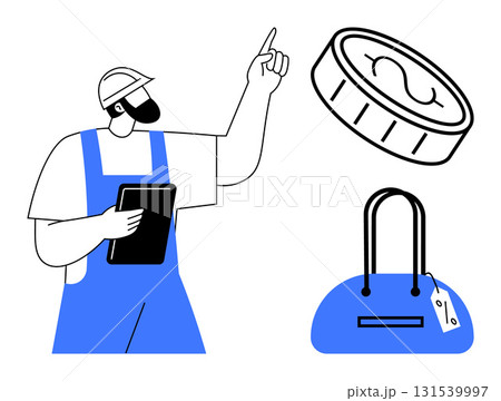 Construction worker in blue overalls holding a clipboard points at a large coin as handbag with price tag sits nearby. Ideal for finance, consumer habits, construction, economy, retail, business